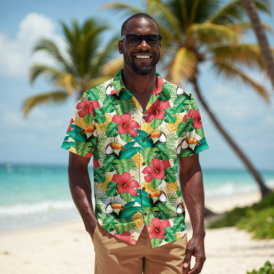 "Toucans Hiding in Hibiscus" Hawaiian Shirt - 100% Cotton