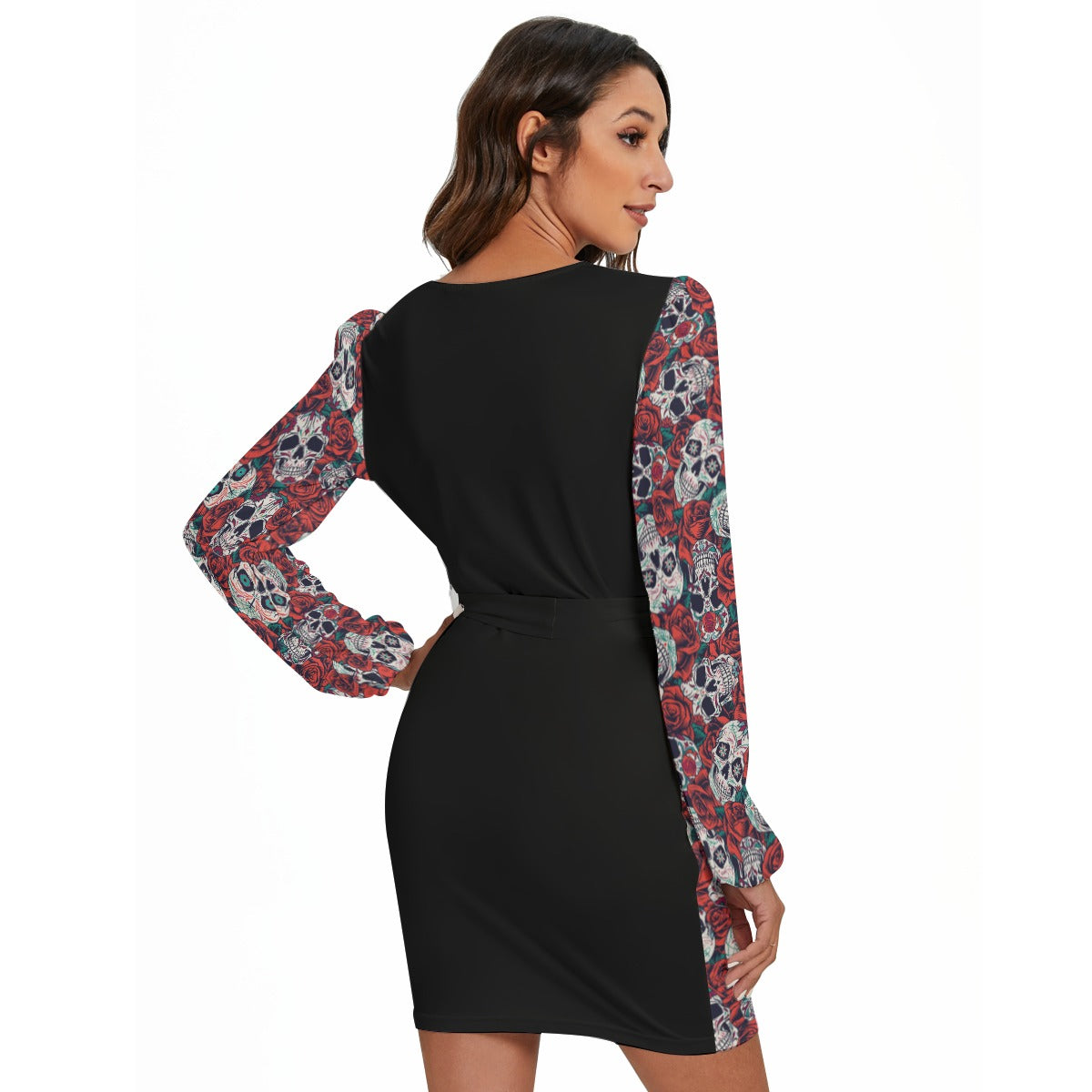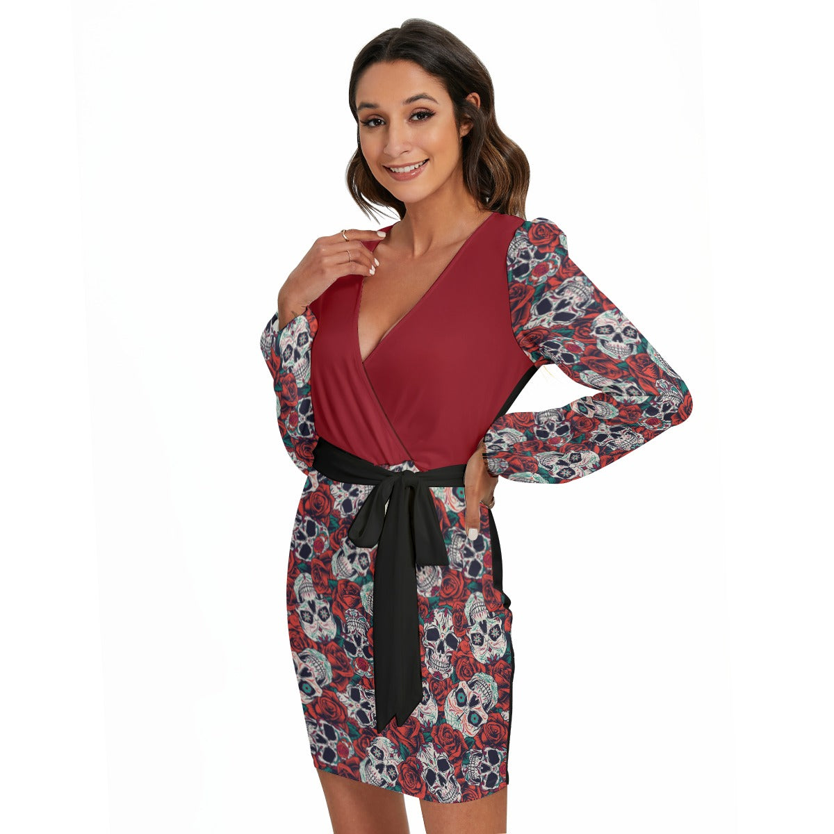 "Dia de Muertos in Roses" Women's Long Sleeve Dress With Waist Belt