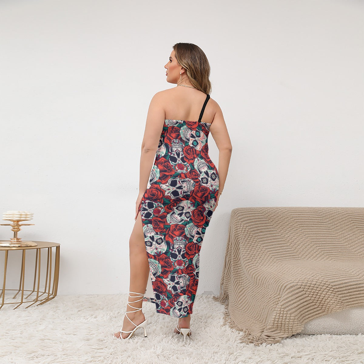 "Dia De Muertos in Roses" Women's Oblique-Shoulder Exposure Dress With Side Split (Plus Size)