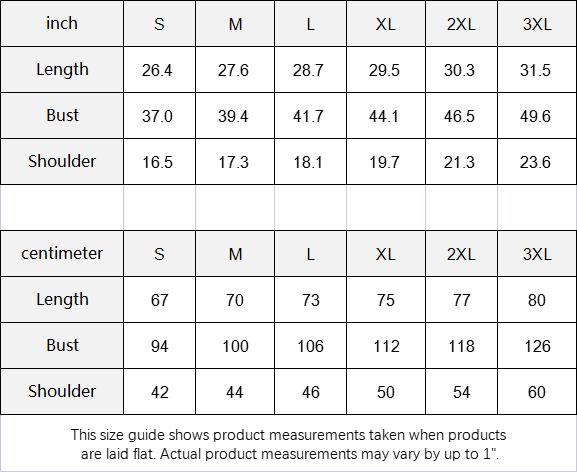 The size guide shows approximate product measurements taken when products are laid flat. Actual product measurements may vary by up to 2". Size Chart is located at the end of the photos. Product may differ from mockup pictures.