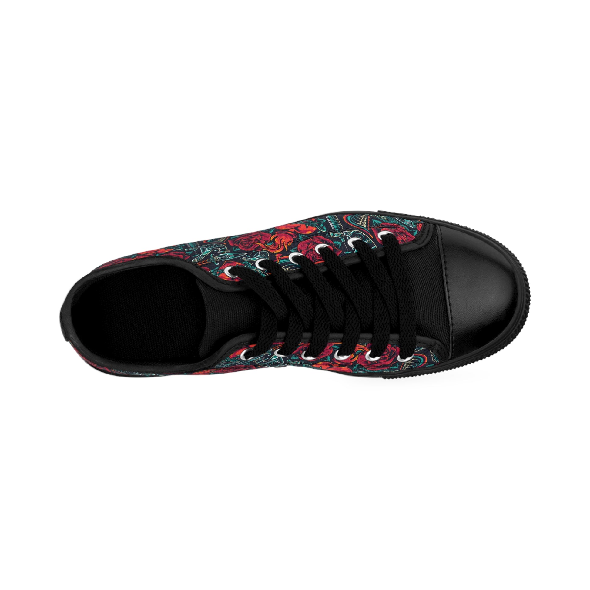 Artful Tattoo-Inspired Design: The vibrant pattern features classic tattoo elements, including roses, swallows, sacred hearts, and tattoo guns, creating a visual masterpiece that’s both edgy and heartfelt. These kicks will turn heads with every step! 🌹🕊️