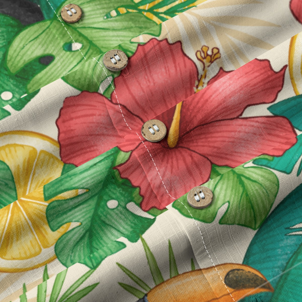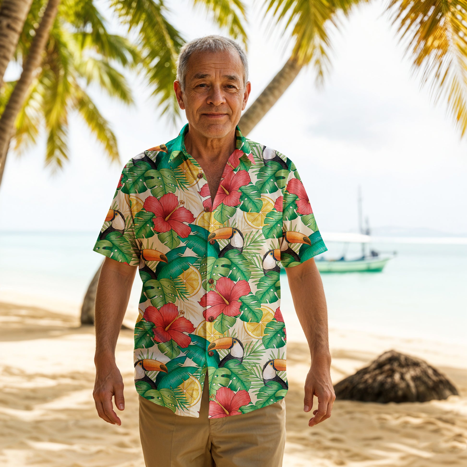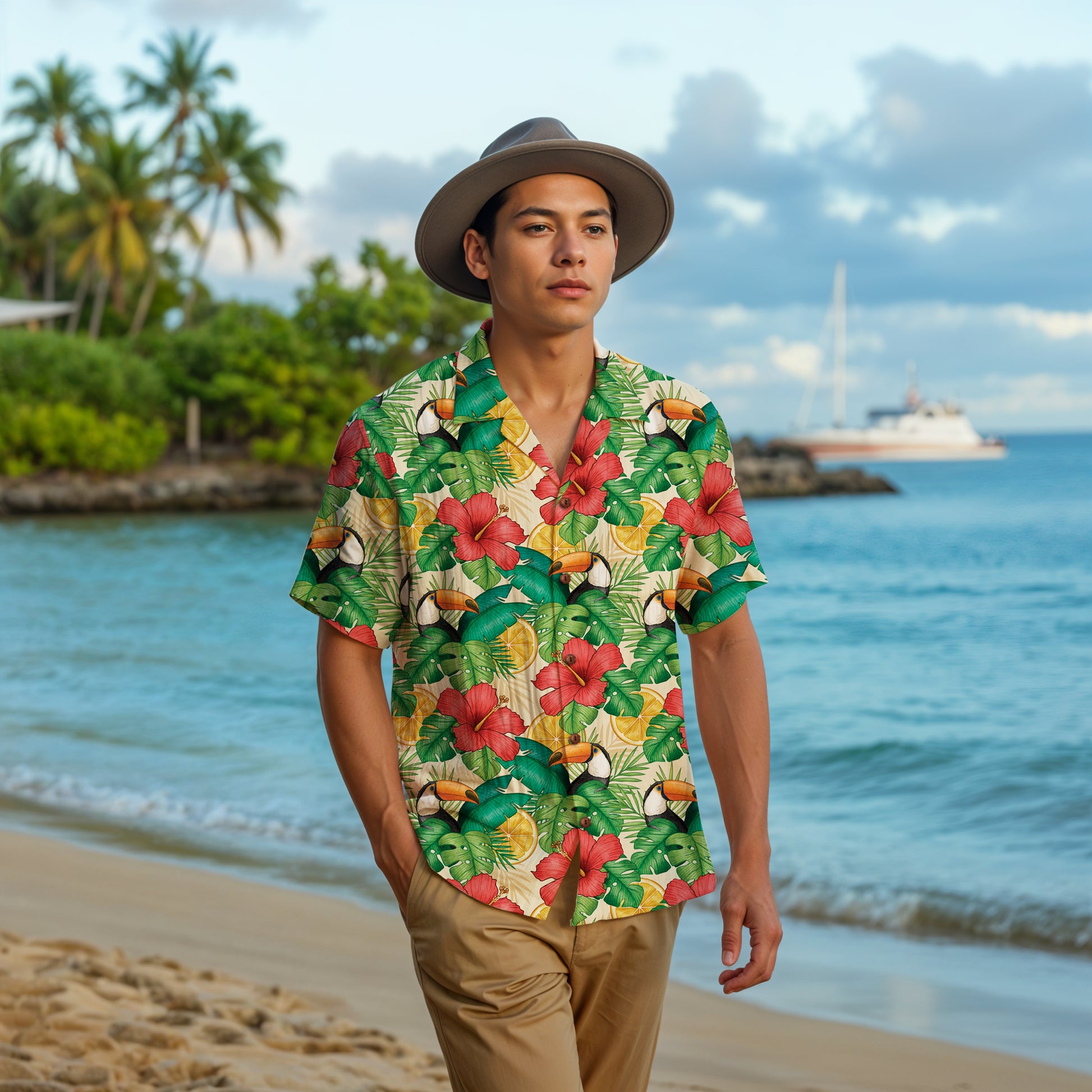 🦜 Unique Design: Adorned with vibrant tropical patterns, this shirt embodies the untamed spirit of the islands. It's more than just clothing; it's a wearable adventure that brings the exotic allure of the island scene to your wardrobe.